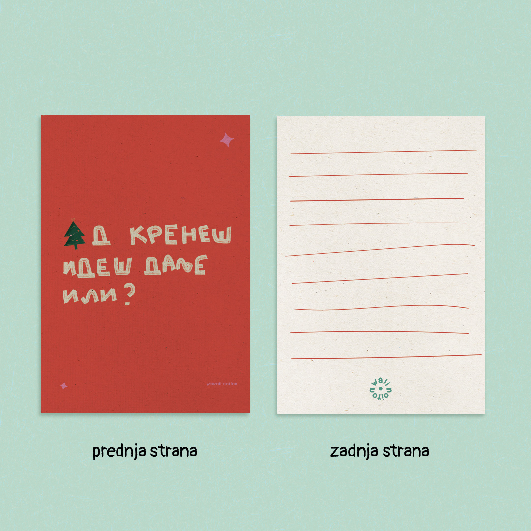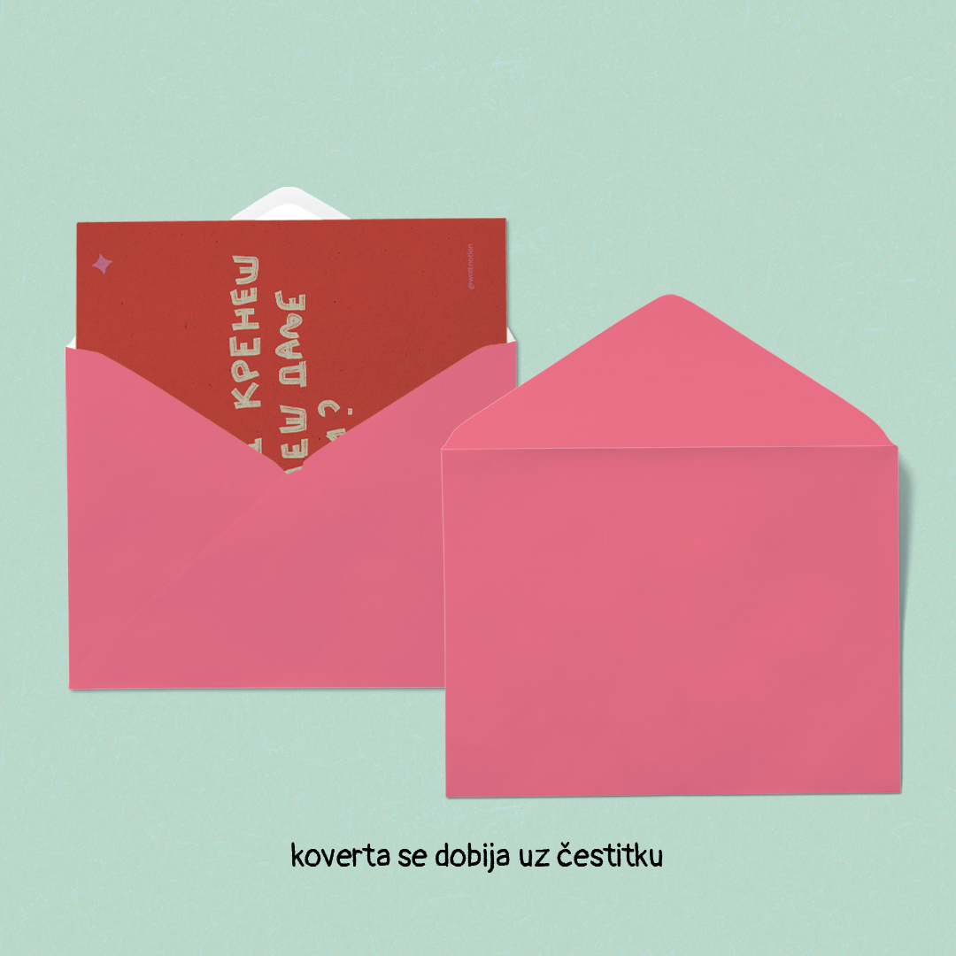 Čestitka je štampana na flora anice 300gr papiru, sa grain teksturom. Štampa je obostrana. Prednja strana čestitke je print ''IDEŠ DALJE?'', a na zadnjoj strani se nalazi prostor za tvoj tekst.